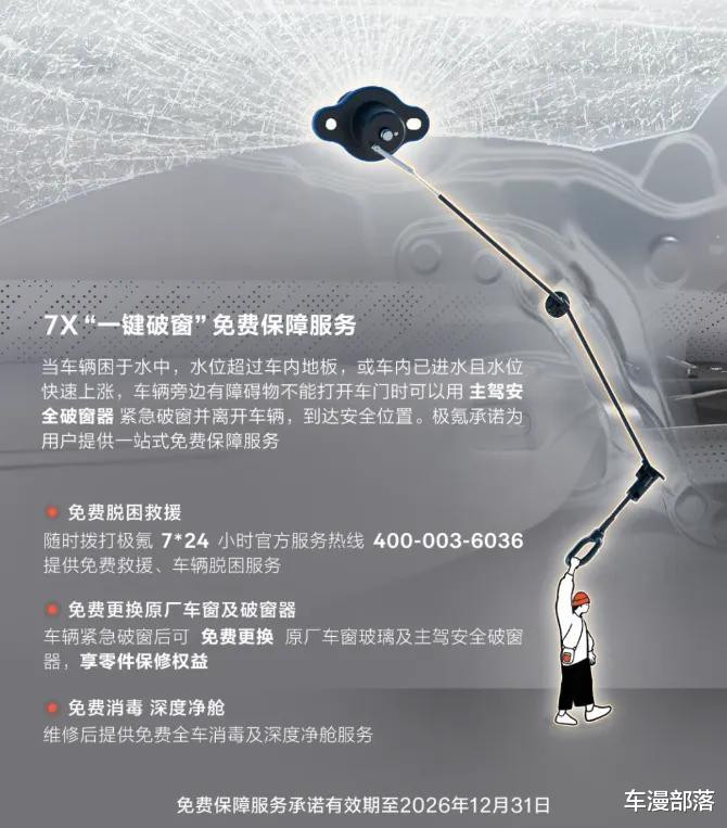 当然,针对这些安全问题,车企们也不断在绞尽脑汁,甚至捣鼓起“外挂式”的安全机制。比如之前看到的电池弹射技术,就很安全了,只是倒霉的是别人而已。最近漫哥看到极氪7X也非常时机巧妙地推出一键破窗免费保障服务,简单来说主要就是一个主驾安全破窗器。虽说官方介绍不是应用于着火场景,但是一旦车辆发生燃烧、车门打不开的情况,这也不失是个逃生办法吧。